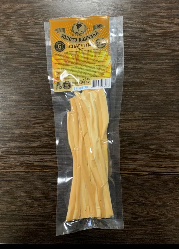 Сыр спагетти "Золото Колчака" копченый . Вес 100гр , в коробке 5кг ( 50шт ) .